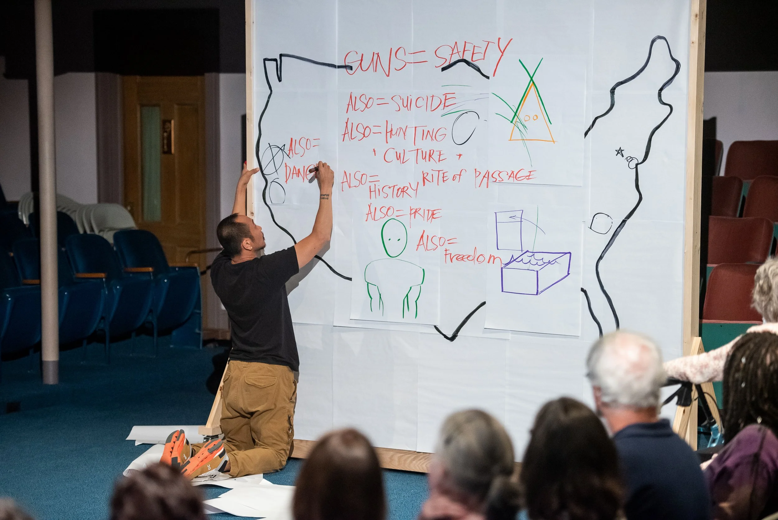 The Great American Gunshow is an interview-based project exploring American gun culture, gun violence and trauma, and the tension within our society over the “right of the people to keep and bear Arms.” Created in partnership with numerous host organizations, Gunshow will document, map, archive and reflect our collective experience through a series of theatrical presentations across the country, each imagined as a unique hybrid of a live performance and a participatory town hall event. Gunshow explores the humanity at the heart of the gun debate and invites participants to engage in a more nuanced discussion about guns in America by setting aside political polarization and investigating whether or not we can find common ground.